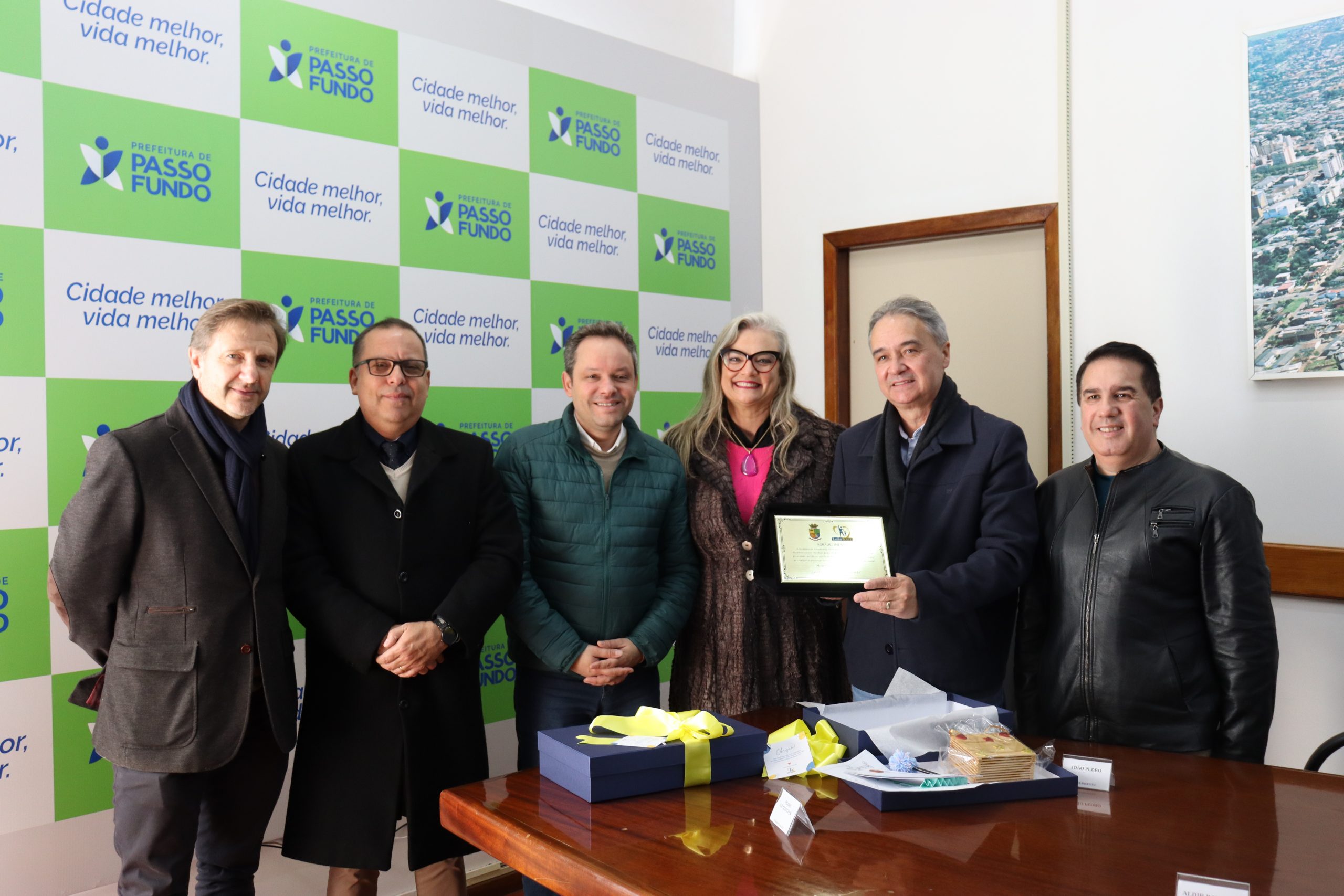 No dia 14 de junho, a Presidente Thaise Nara Graziottin Costa, o Vice Presidente Aldir Balbinot e o Tesoureiro Mário César de Oliveira França, que compõe o Conselho Administrativo da Assistência Social Arquidiocesana Leão XIII, se fizeram presente na Prefeitura de Passo Fundo para homenagear e agradecer o Prefeito Pedro Almeida e o Vice Prefeito João Pedro Nunes pela concessão de uso dos Centros de Juventude José Alexandre Zachia e São Luiz Gonzaga.